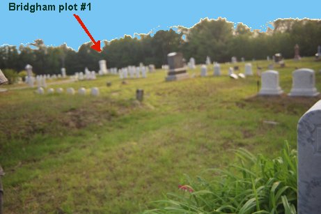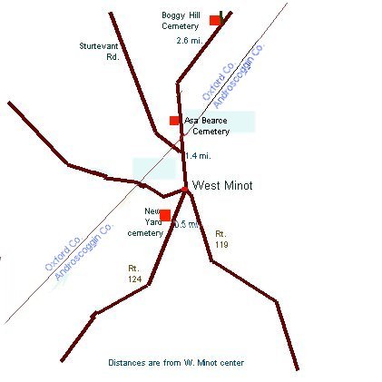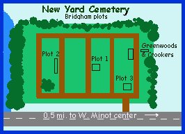 New Yard CemeteryGoing south on 124, 0.5 mi west ofW. Minot, METhis is a medium size cemetery with many stones. There are some Crookers (Joshua, d. 5/3/1820 and wife Ruth, d. 5/18/1845, Alexander, d. 10/10/1875, wife Roana, d. 12/30/1834) and Greenwoods (Rodolph d. 9/22/1880 & wife). There are three large plots with Bridghams, as follows: | ![]() | ||||||||||