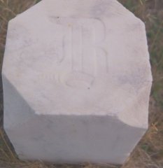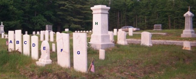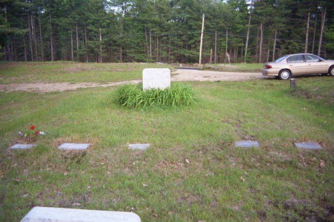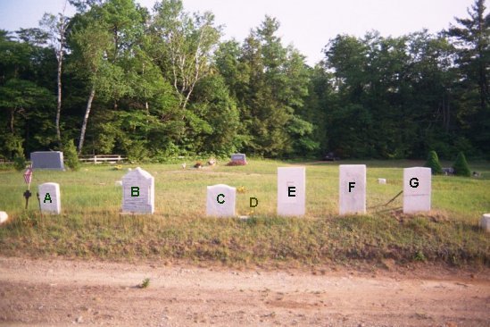| These stones are lined up along a stretch of the cemetery lane that starts at the large maple (?) tree. There are edge markers on either side of the plot, square stones about 4 inches high with an embellished B on each. The inscriptions on the stones are: | |||||||||||